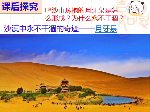 云端课在《月牙泉》悠扬的歌声和美丽画面中结束, 魏老师结合甘肃敦煌有关月牙泉的资料设计探究题目:甘肃省“鸣沙山·月牙泉”是怎么形成的,月牙泉为什么永不干涸?为双方学生留下课后继续探讨的空间。